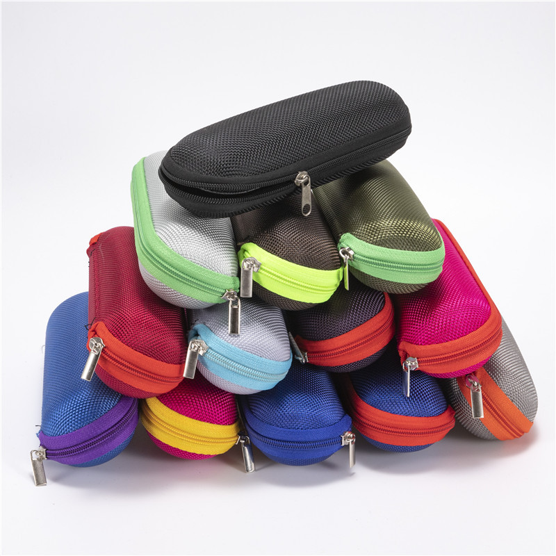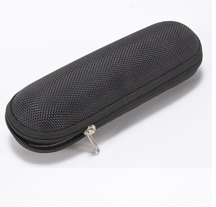 กล่องแว่นตา พิมพ์โลโก้ได้ พร้อมซองผ้า Oxford มีซิป กรอบแว่นทำจากอะซิเตทสีดำเรียบ กล่องบรรจุภัณฑ์แว่นตาขายส่ง ลักษณะกล่องจะกลมๆ พอดีมือ